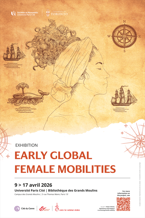 Le projet « Reorienting Female Mobility in the Early Global World (1096-1650) », lauréat 2025 de l’appel UPCité/UoToronto, et ses coordinateurs Ladan Niayesh (ECHELLES, UMR 8264) et Sebastian Sobecki (Centre for Medieval Studies, University of Toronto) ont le plaisir d’annoncer la tenue de l’exposition « Early Global Female Mobilities » à la Bibliothèque Universitaire des Grands Moulins, Université Paris Cité.