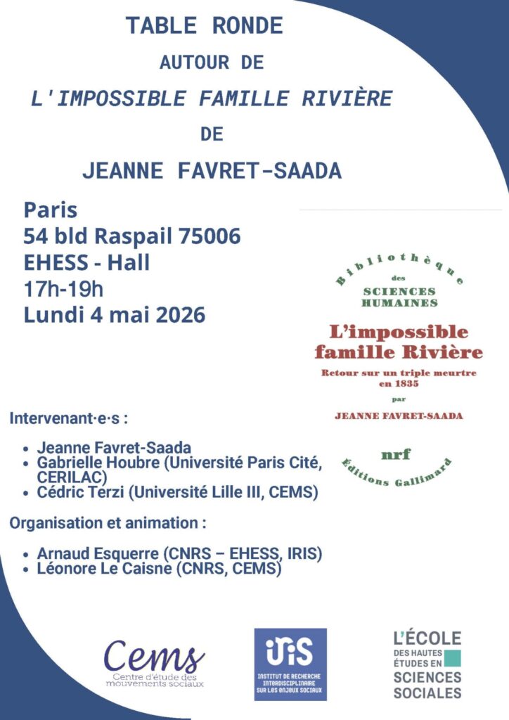 À l’occasion de la parution de L’impossible famille Rivière. Retour sur un triple meurtre en 1835 (éditions Gallimard, 2026), une table ronde aura lieu le lundi 4 mai 2026 autour de l’ouvrage et en présence de son autrice Jeanne Favret-Saada.